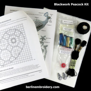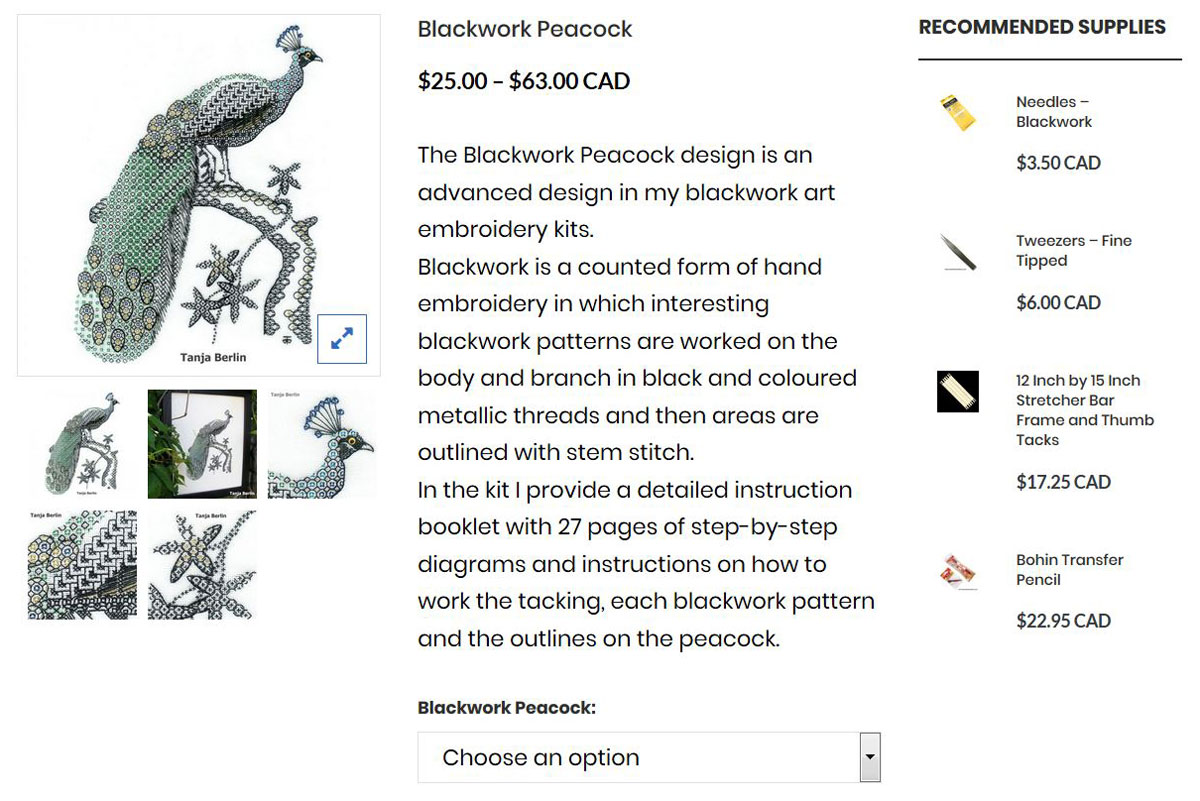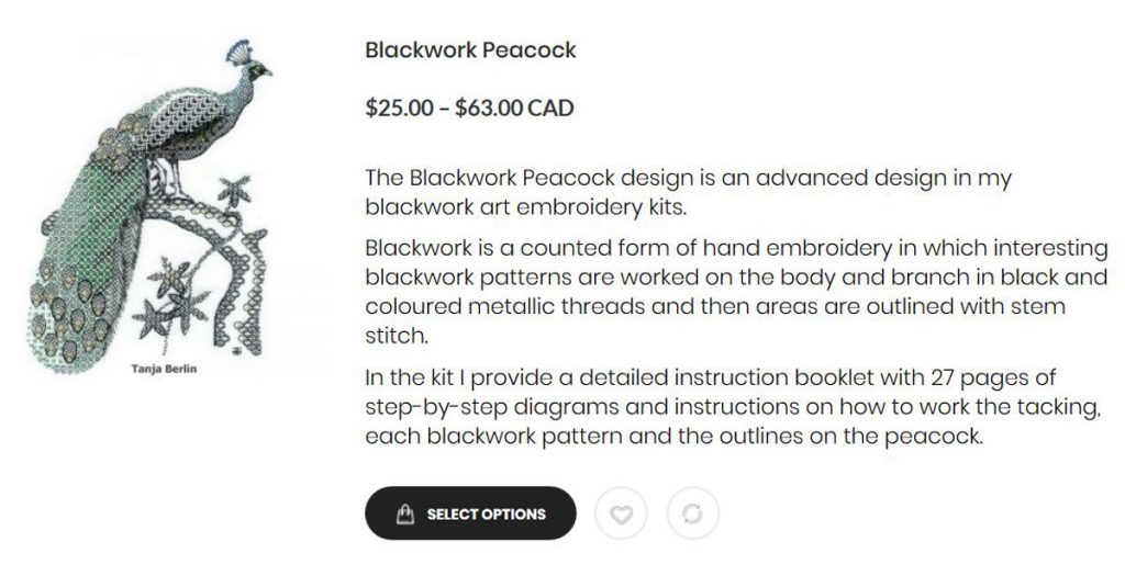 For example the Blackwork Peacock kit options range from $25.00 – $63.00.