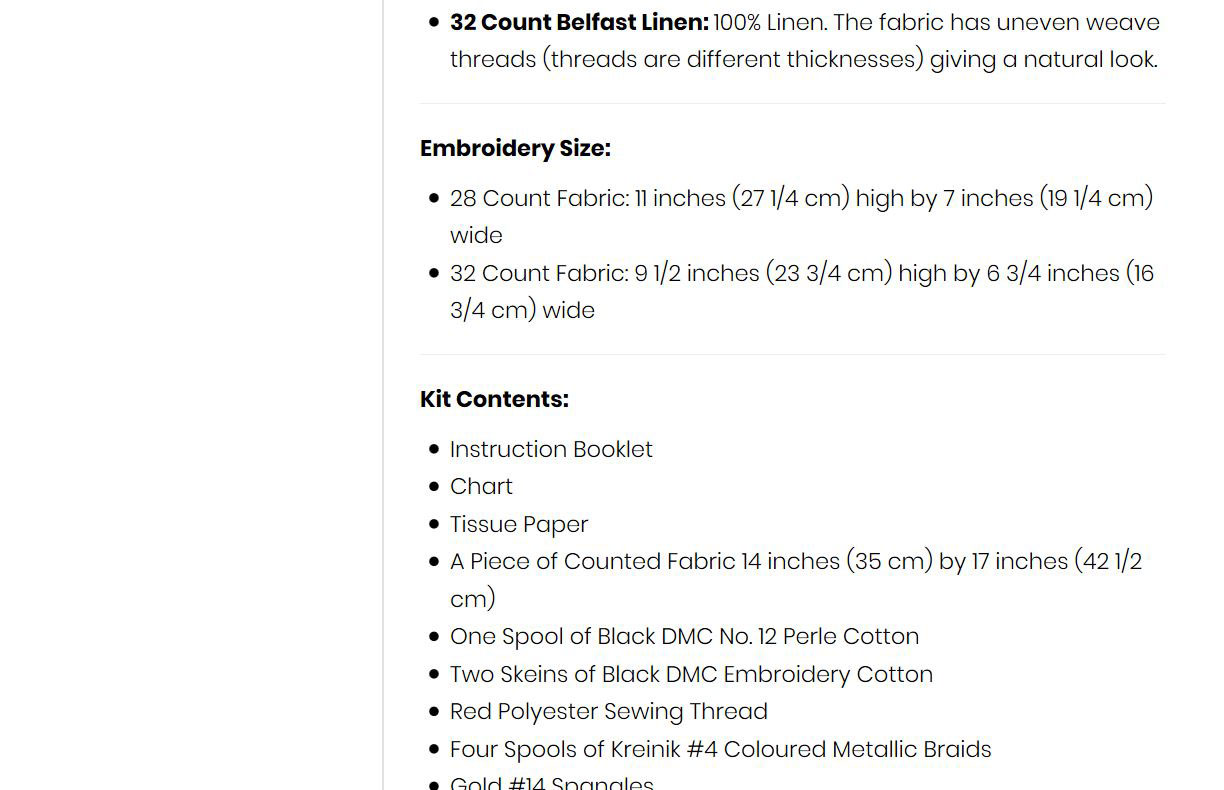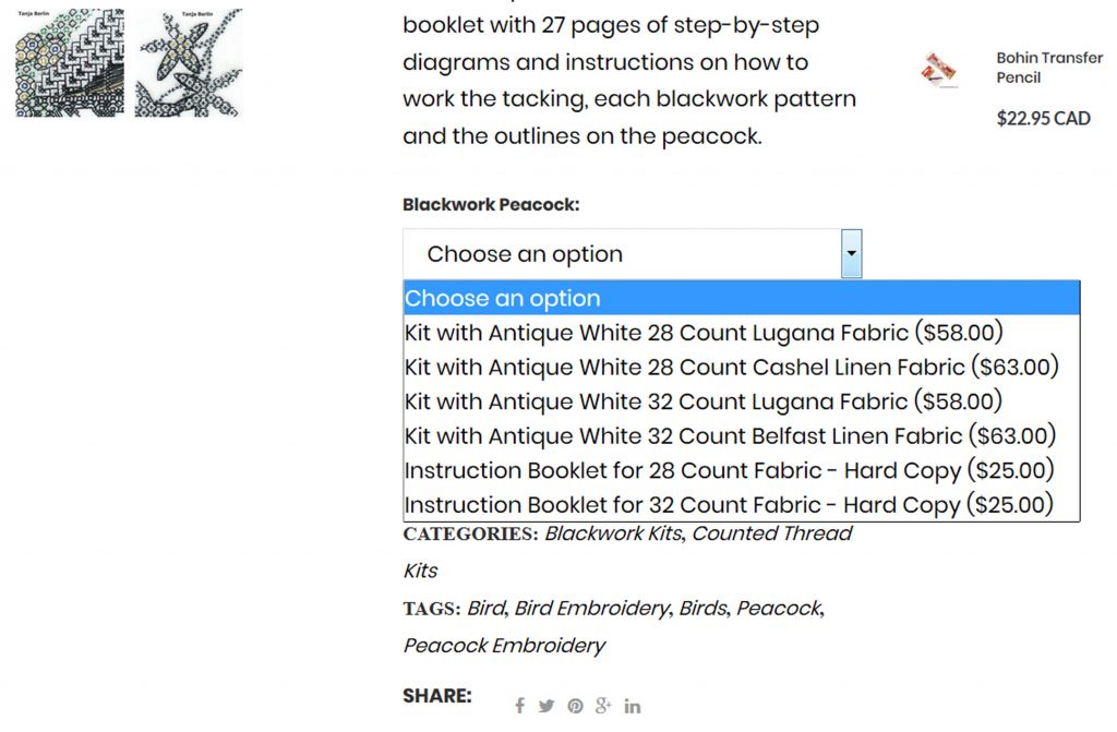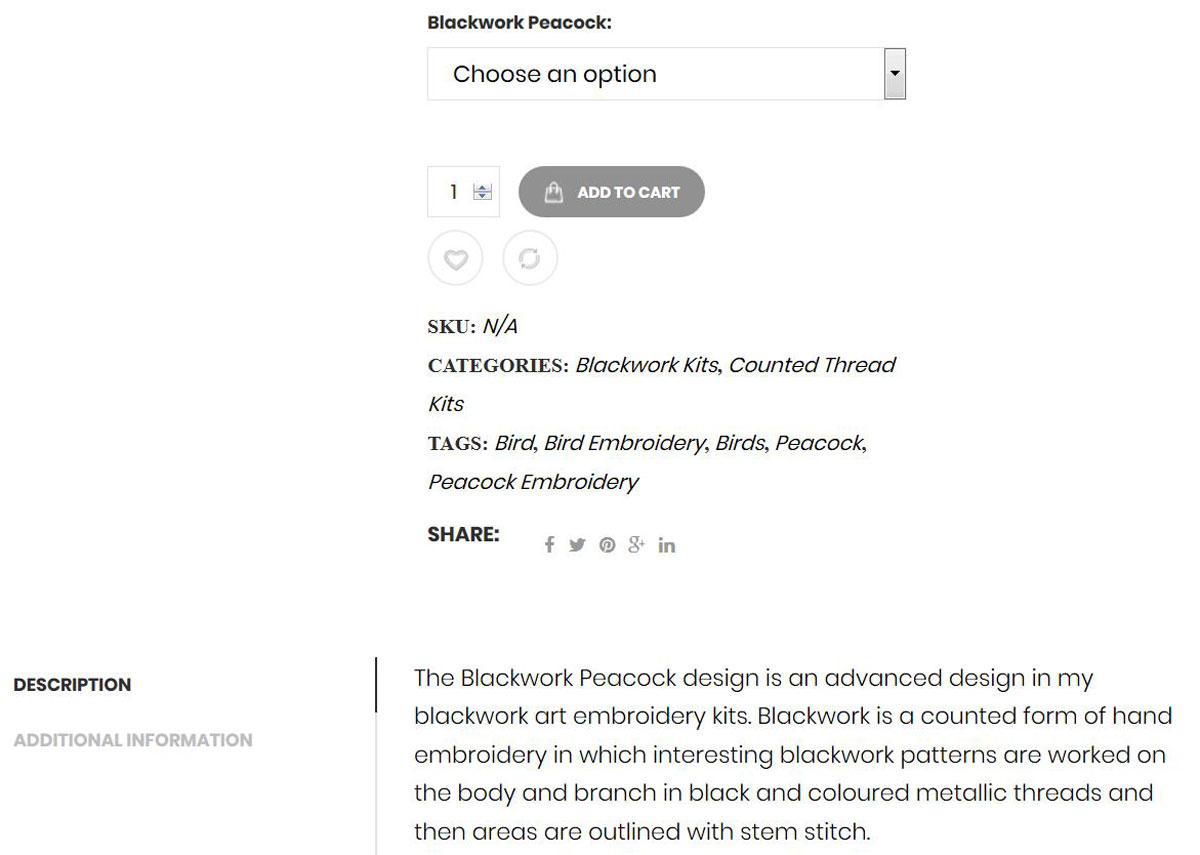 There is a complete description of the blackwork peacock kit below the choose an option drop down list, which lists, the choice of fabrics, size of the embroidery and exactly what’s in the kit.