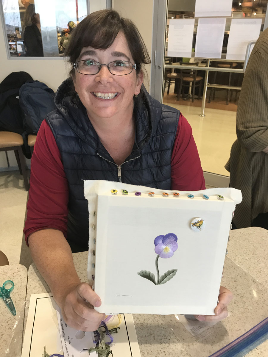 Susan only just joined the embroiderers guild to take my class and wow she amazed me at her speed and accuracy and almost finished the pansy in the two days class. This is very impressive as I would have a hard time in a classroom setting to complete the pansy in two days. She is also a beautiful stitcher.