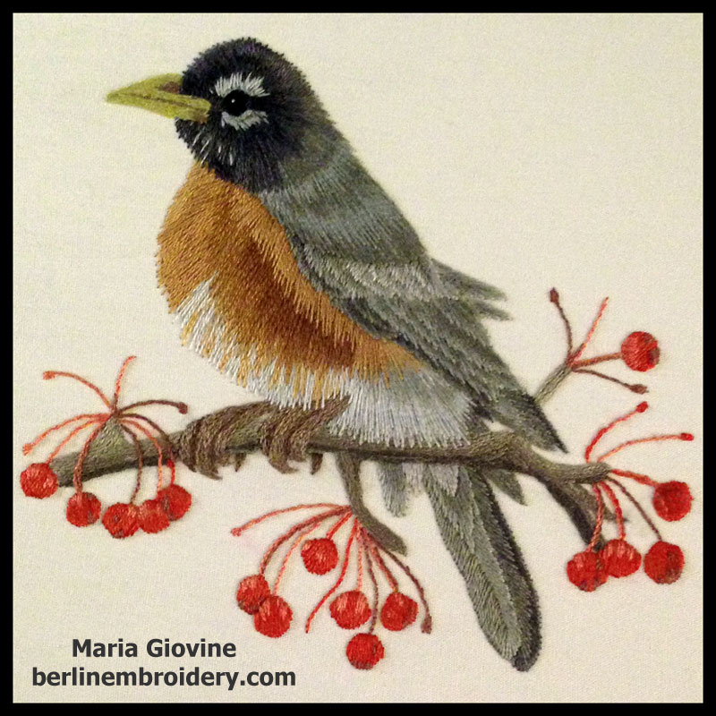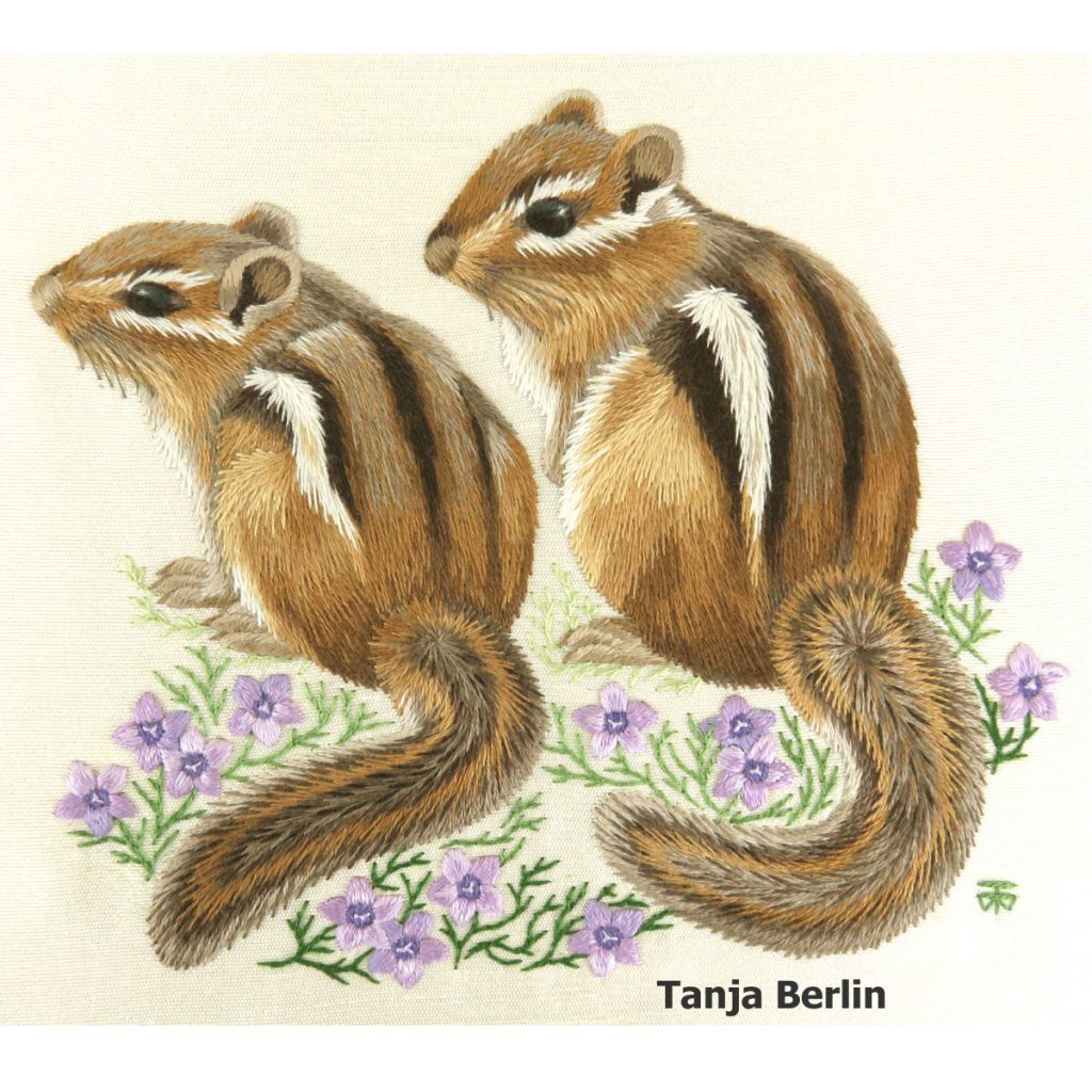 Eileen worked on the Red Fox, this was her first time taking a class in needle painting, her passion is canvas work but wanted to try something different due to having a painful wrist from stitching with heavy threads on stiff canvas. She did very well, surface embroidery comes naturally to her and I hope it will be her new or alternative enjoyment in hand embroidery.