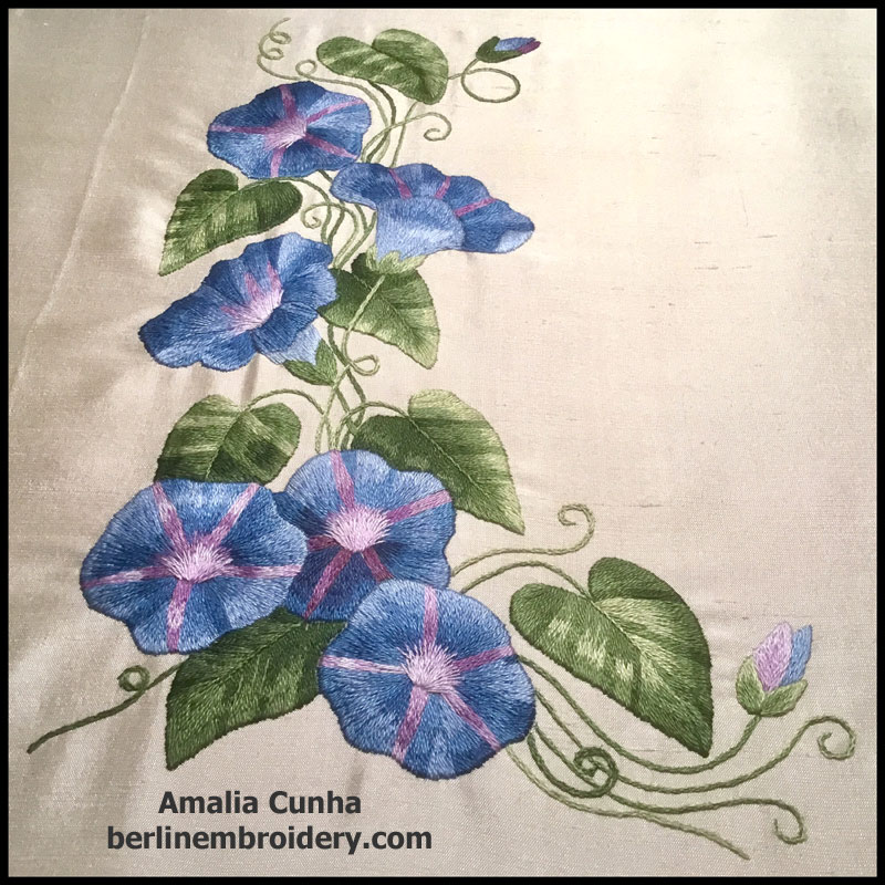 / Aug232019Amalia Cunha in Florida has done a wonderful job of stitching my needle painting Morning Glories embroidery. I am very impressed by her stitching and she is relatively new to embroidery.