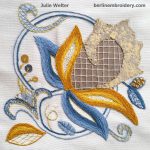 The floral motif is a beginners in my surface embroidery kits. Surface embroidery stitches on the design include: trellis patterns, stem stitch, chain stitch, heavy chain stitch, buttonhole stitch, French knots, seeding, spider web filling, herringbone stitch and more.