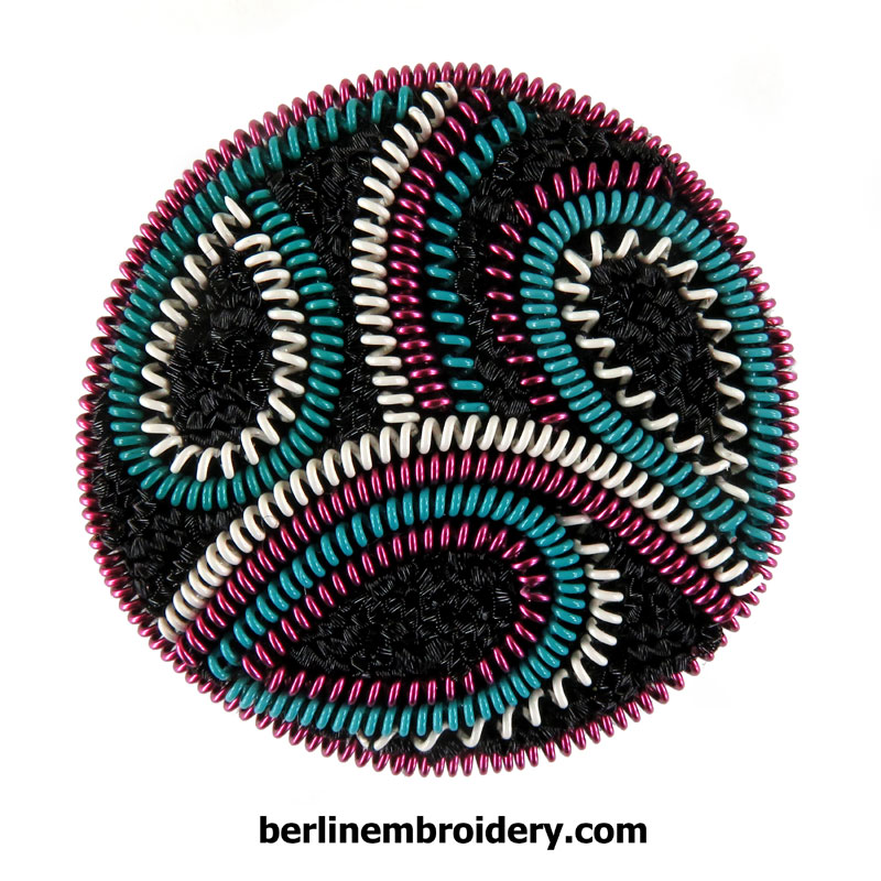 The button features a detailed print of an original hand embroidery design, stitched by Tanja Berlin
