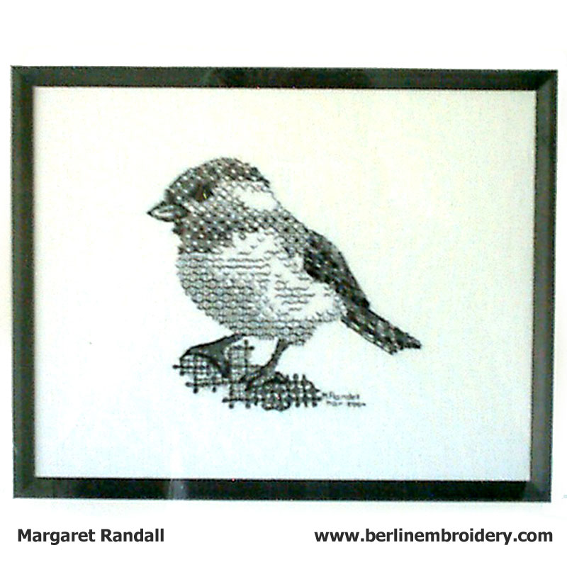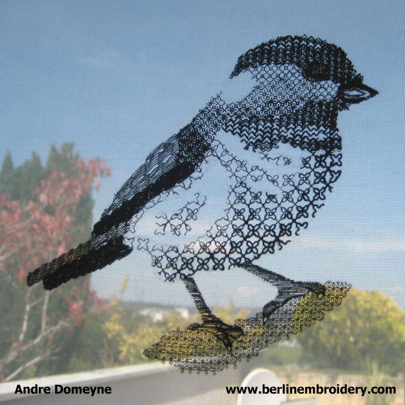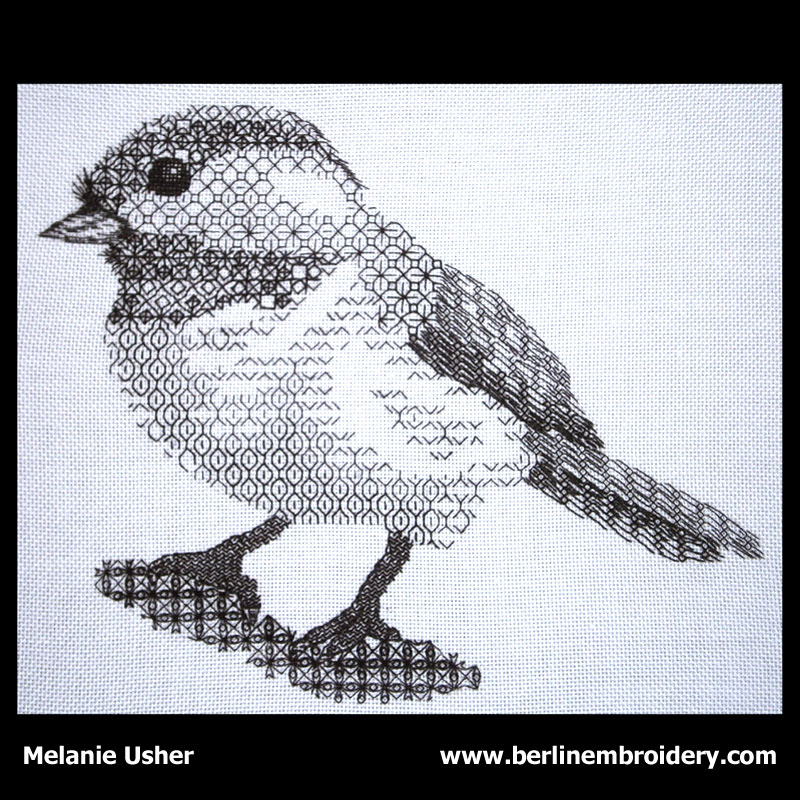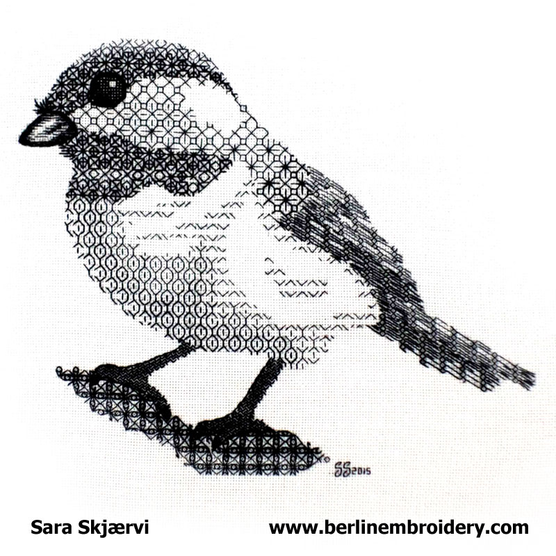 “Andree worked the blackwork Chickadee on silk gauze so the embroidery is reversible – truly impressive – Tanja”