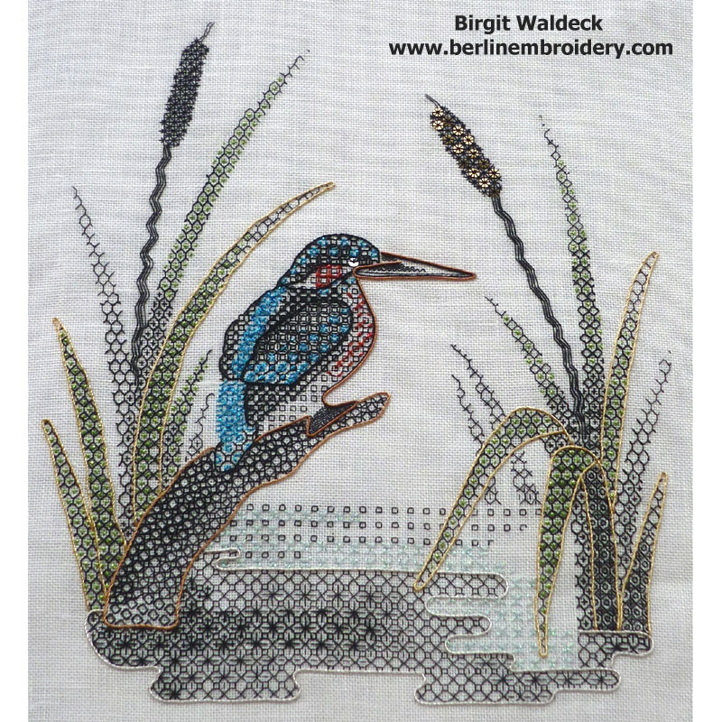 “I have finished the blackwork kingfisher embroidery. It was fun to do, and the result pleases me a lot. It is a beautiful kit, I liked it very much. I didn’t embroider it exactly as described, because I made a mistake with the transfer and I had to improvise a little bit. Also I gave the kingfisher a reddish breast and mask, because the kingfishers over here look like that.”