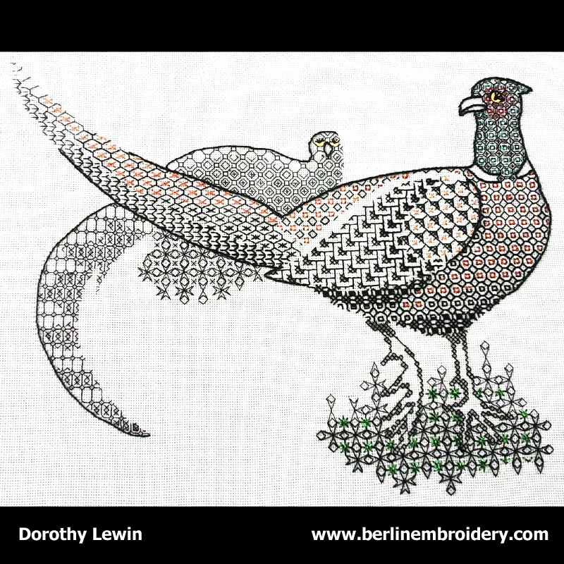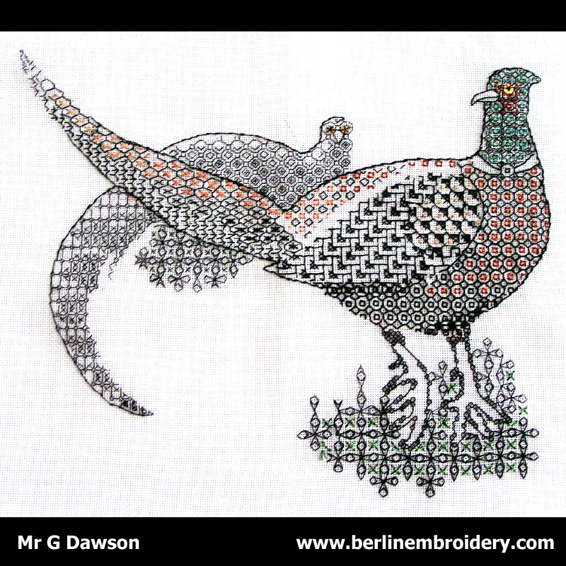 The Blackwork Pheasants were Stitched by Mr G Dawson at the age of 89 in the United Kingdom