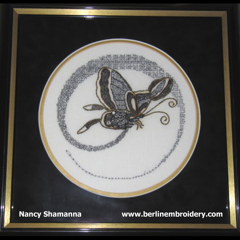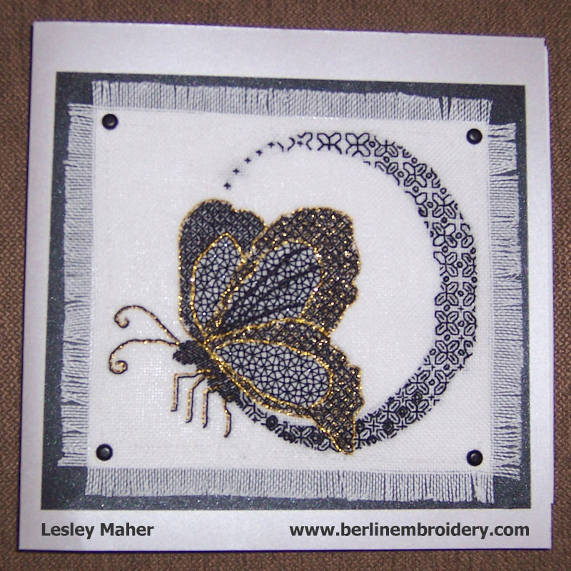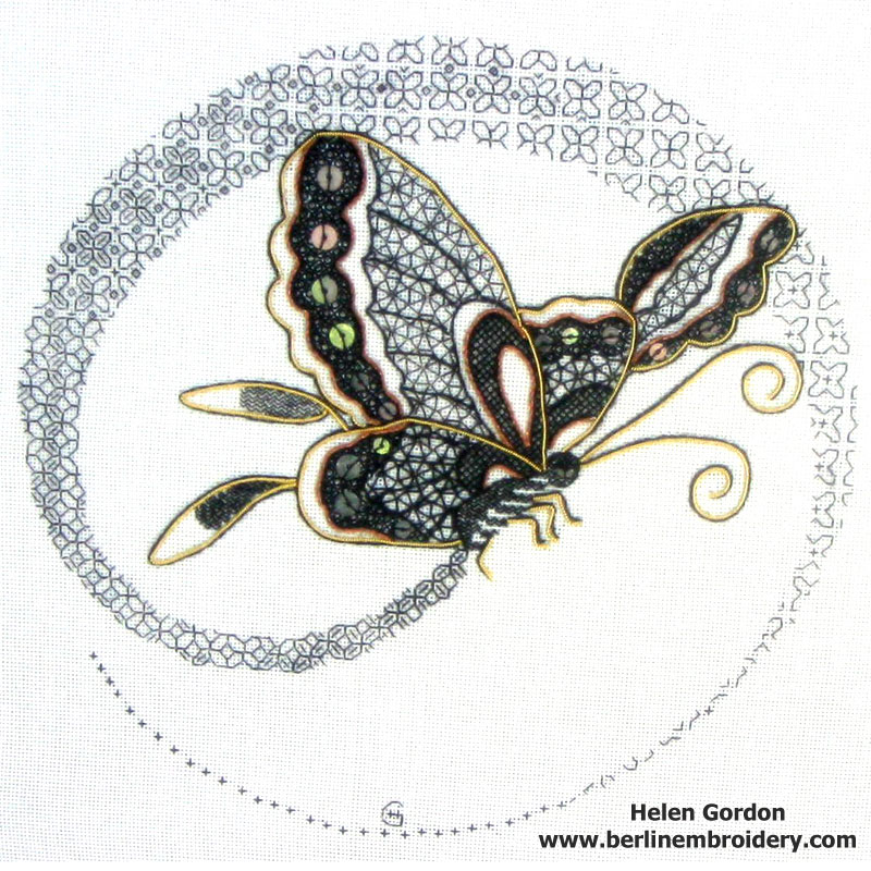 “The butterfly was my first attempt at tissue-design transfer, and a good introduction to working with the metal threads. Your instructions were very thorough”