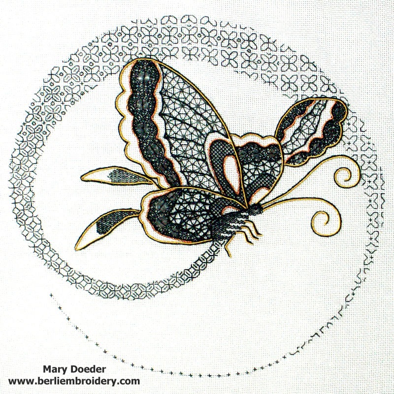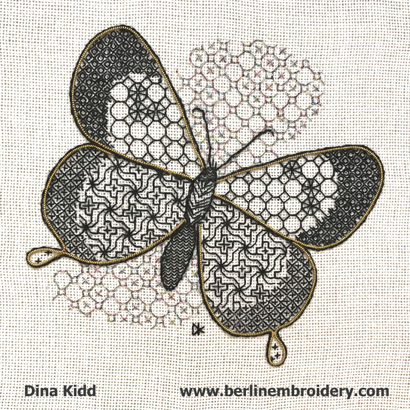 This piece is an exquisite blackwork design which incorporates some beginning goldwork techniques to beautifully accent the butterfly.