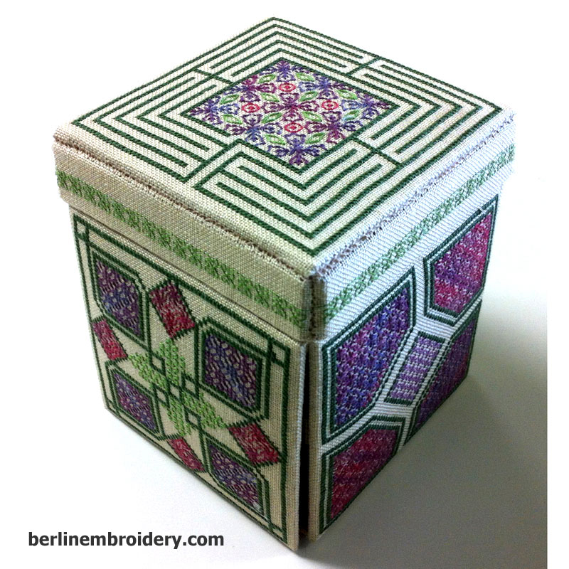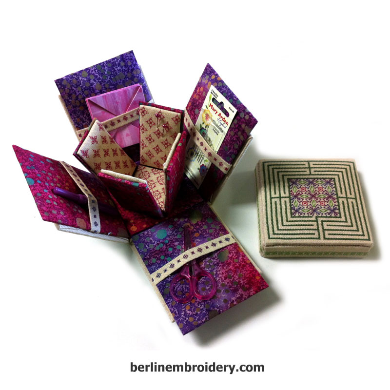 The patterns of the Blackwork Etui Box was worked with verigated embroidery cottons on 32 count antique white linen fabric. The patterns were complimented with a beautiful cotton quilting fabric for the inside panels.