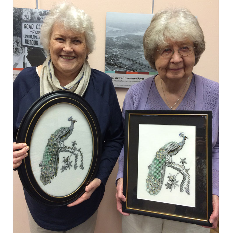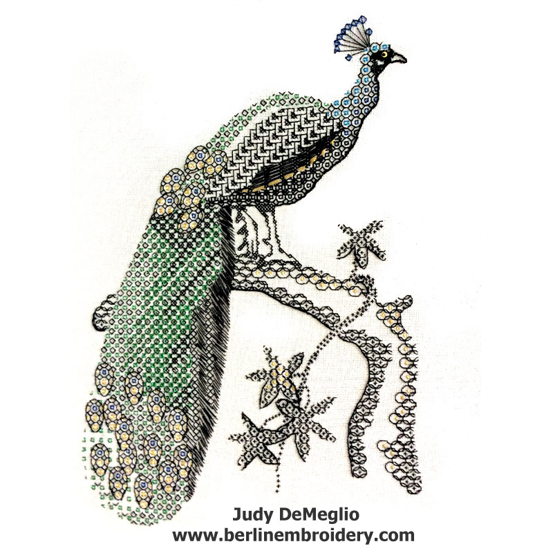 Blackwork Peacocks Stitched by Delores Pullum on the Left and Betty Lewis on the Right in TN USA