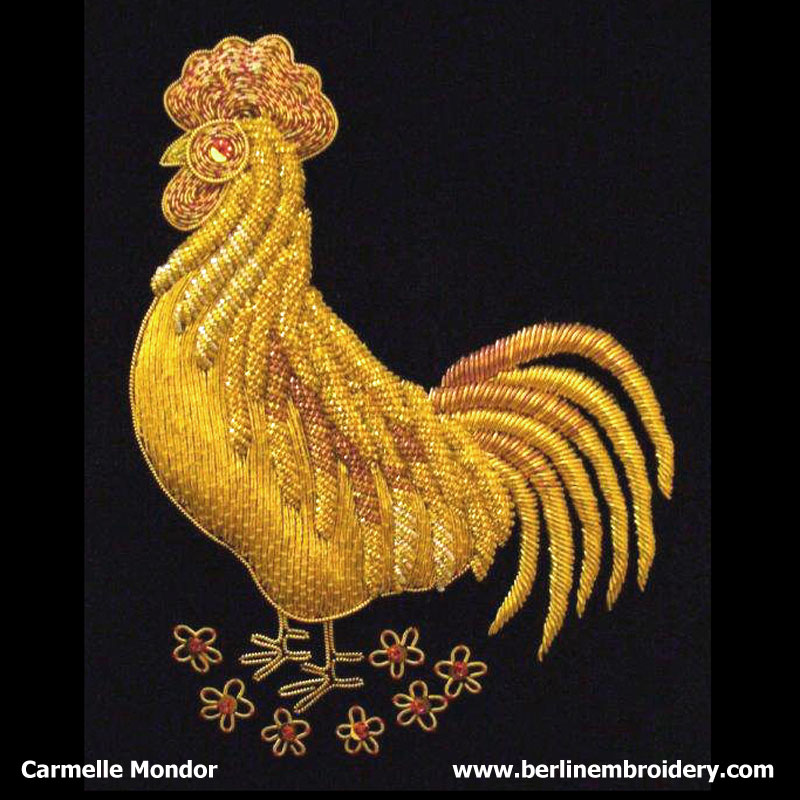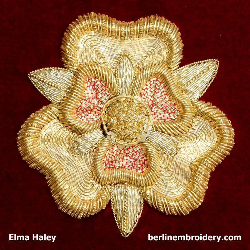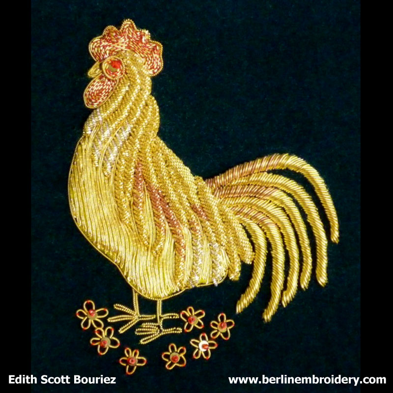 “I really enjoyed doing the Tudor Rose. It’s fun when people look at it and say “how did you do that?” and you know it started with layers of felt and string padding and with the purl on top, ends up in this beautiful shape. The Rooster it still my favorite. I used the same framing on a Rooster (framed it in a square) and the Tudor Rose and they look good together.”