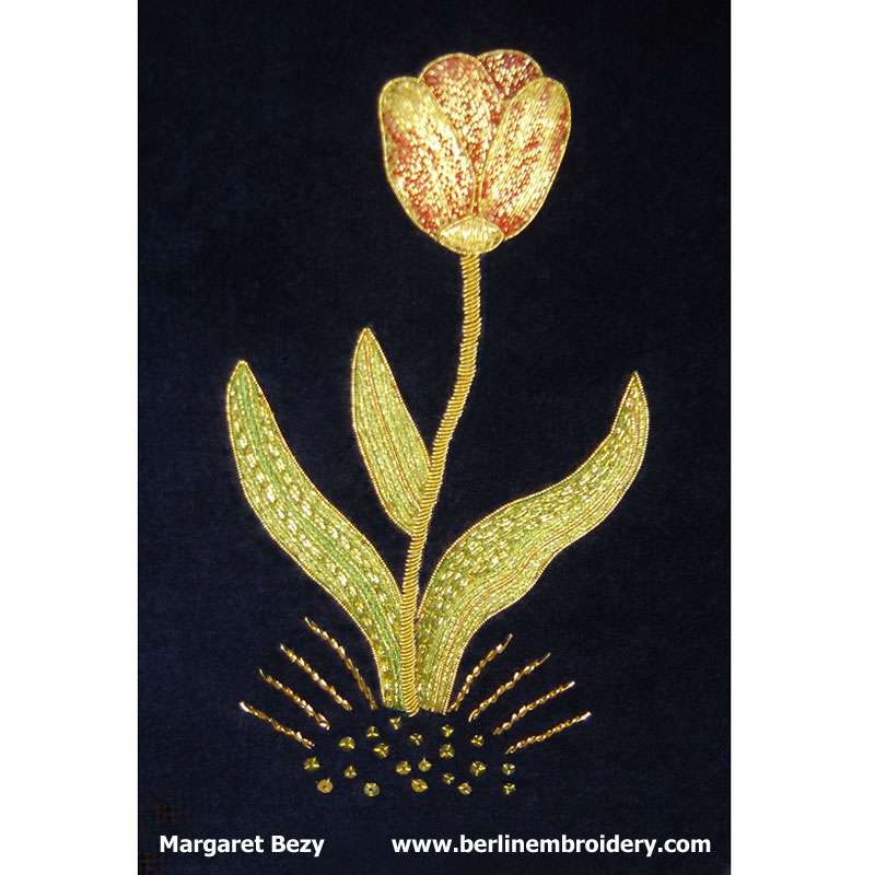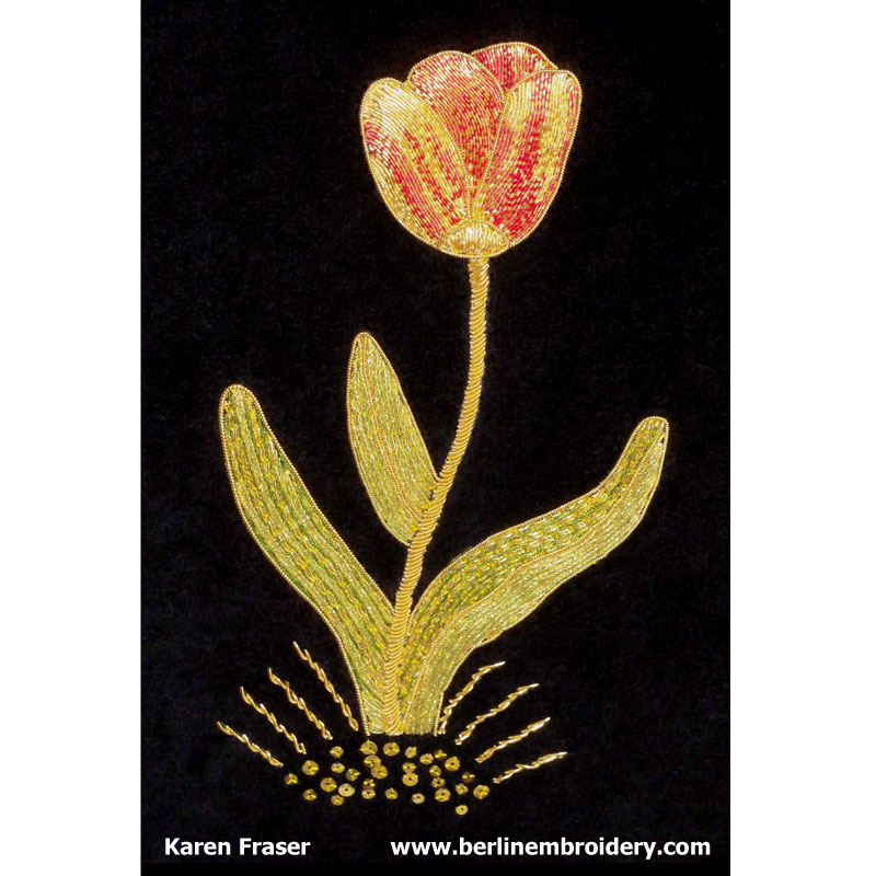 “The tulip is a wonderful piece to stitch. It is a great pattern to learn color couching gold as there are many possibilities in the colors of a tulip.