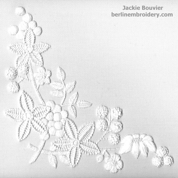 “Mountmellick proved to be very satisifing, as it allows one to add depth to a monochromatic piece. Tanja’s design is a sampler in Mountmellick, allowing a beginner to experience no less than 10 different stitches.