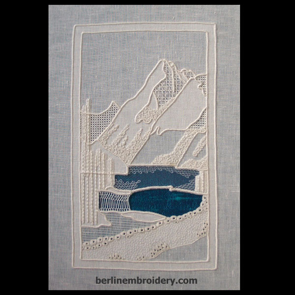 “This piece is worked from Tanja’s fine whitework mountains kit. I added the outer border line of stitches, creating the effect of a frame around the picture. I have mounted the embroidery on peacock blue silk.”