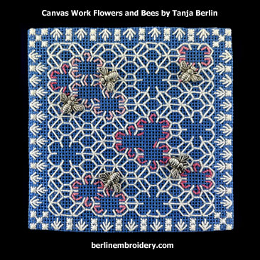 The lacy stitches are worked in Perle cotton on 18 count mono canvas. It is a counted thread needlework technique, great for all level of stitches and can be worked in the hand in your most comfy chair (no frame necessary).