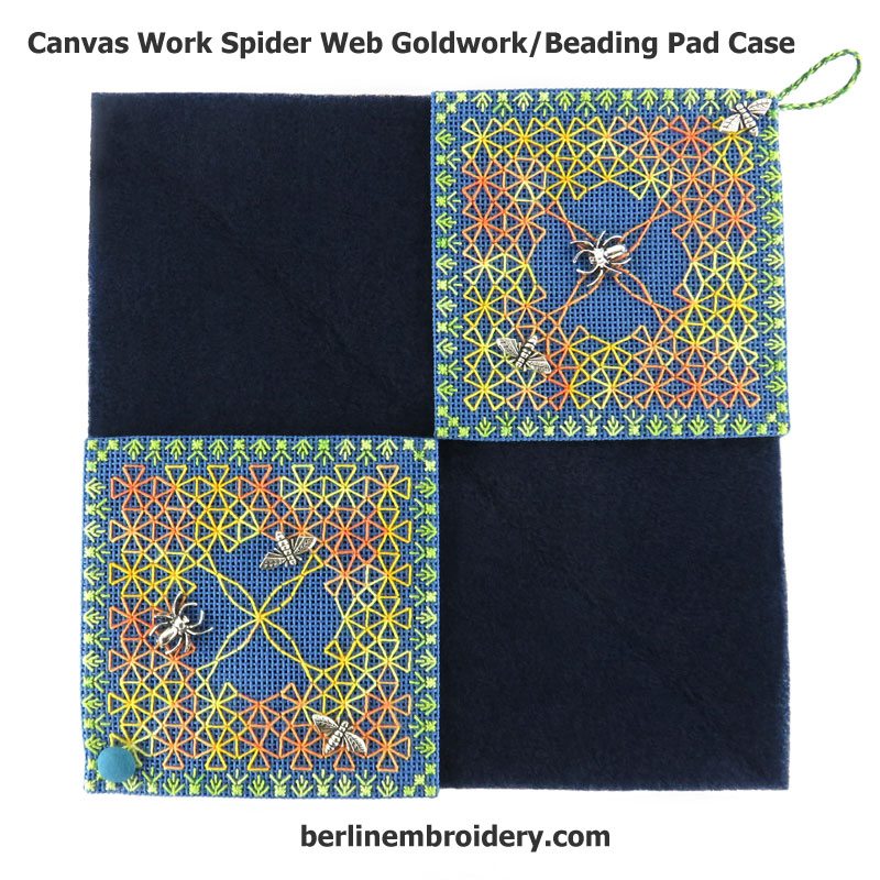 The Canvas Work Spider Web case is a beginners canvas work embroidery design. There is a choice of three spider web patterns in the instructions that can be finished into a goldwork/beading pad case OR a needle case. There is enough canvas in the kit to make one case.