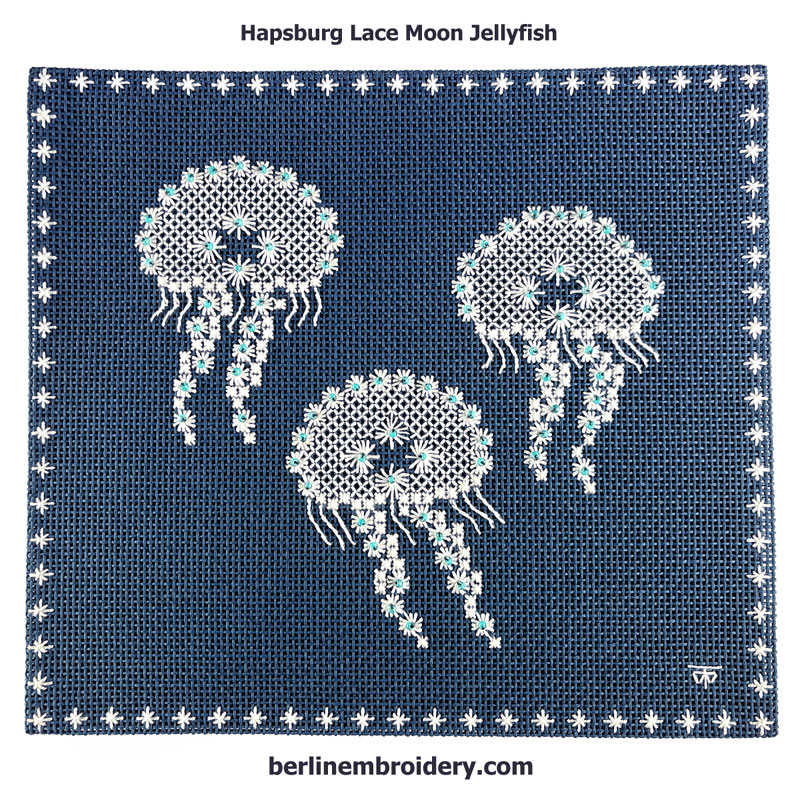 The Hapsburg Lace Moon Jellyfish are a beginners canvas work design and the Nettle Jellyfish is an intermediate canvas work design. You can purchase the kits or instructions separately or together to save.