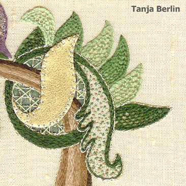 The design is inspired by traditional Jacobean tree motifs but on a smaller scale and incorporates modern materials such as silk ground fabric, cotton threads, metallic thread, organza fabrics and kid leather.