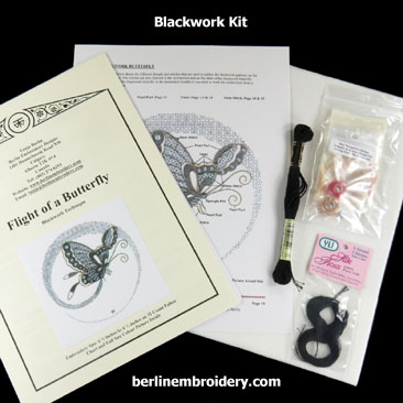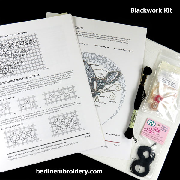 The Flight of a Butterfly blackwork design is an intermediate design in my blackwork art embroidery kits. Blackwork is a counted form of hand embroidery in which interesting blackwork patterns are worked on the wings, body and flight trail and then areas outlined with metal threads such as pearl purl and twist.