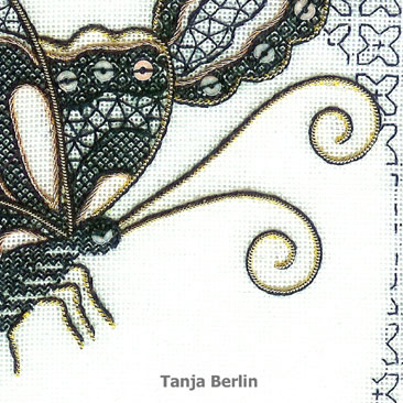 Blackwork is a counted form of hand embroidery in which interesting blackwork patterns are worked on the wings, body and flight trail and then areas outlined with metal threads such as pearl purl and twist.