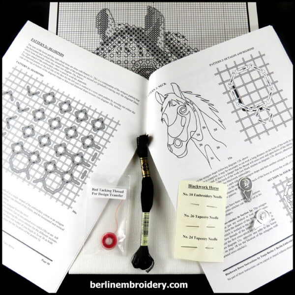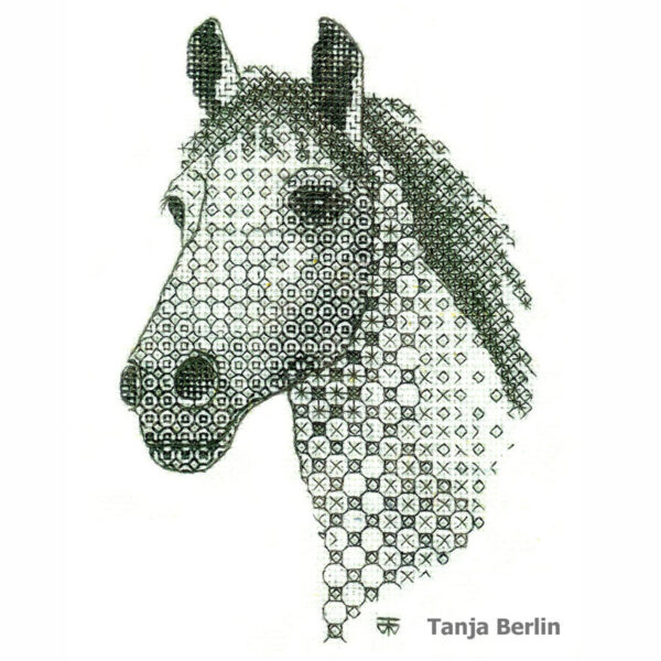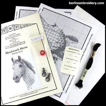 Blackwork is a counted form of hand embroidery in which interesting blackwork patterns are worked on the horse and then areas outlined with stem stitch. You have a choice of working the design from a full chart or in the tissue paper transfer method, instructions for both are in the detailed instruction booklet.