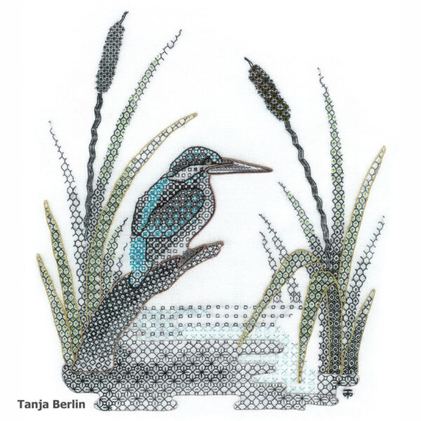 The blackwork kingfisher is advanced and is not intended to be worked on 14 or 16 count Aida, so you should be able to count on 28 count or 32 count fabric. A stitching light and magnification are an asset to work the embroidery. If you are not sure if the technique is for you, you could try the Introductory to Blackwork -Small Blackwork Butterfly first which is quicker and easier to work and the Blackwork Lovebirds – Just the Two of Us which will give you a good foundation in the blackwork technique.