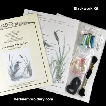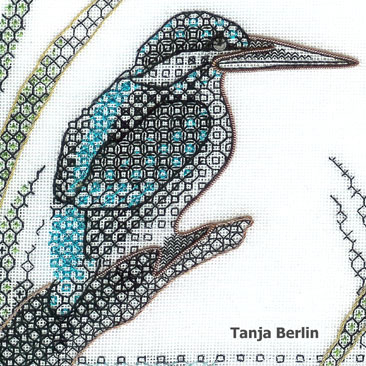 Blackwork is a counted form of hand embroidery in which interesting blackwork patterns are worked on the kingfisher and background in black and coloured metallic threads and then areas are outlined with metal threads such as pearl purl and twist.