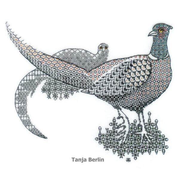 | Blackwork Pheasants | Instructions for 28 Count Fabric – PDF, Instructions for 32 Count Fabric – PDF, Instruction Booklet for 28 Count Fabric – Hard Copy, Instruction Booklet for 32 Count Fabric – Hard Copy |