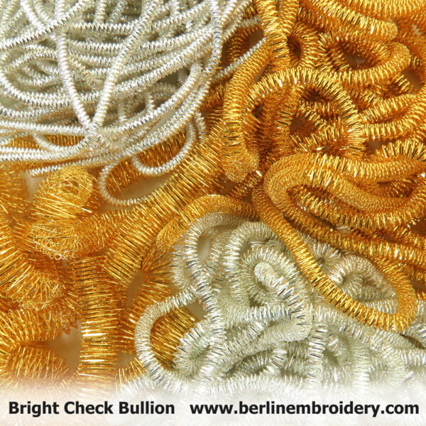Bright Check Bullions are available in gilt and silver and are made up of a very fine wire thread that is wound into a soft flexible hollow tube with a jaggered/serrated and shiny surface.