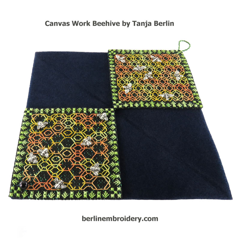 The Canvas Work Beehive case is a beginners canvas work embroidery design. There are two designs that can be finished into a goldwork/beading pad case OR a needle case. There is enough canvas in the kit to make one case.