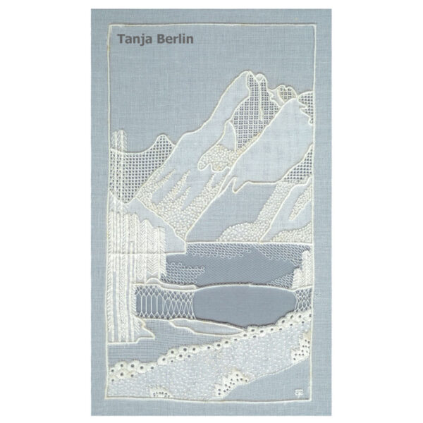 The embroidery can be mounted on a coloured background which shows up the density of the fabric layers and the white embroidery threads.