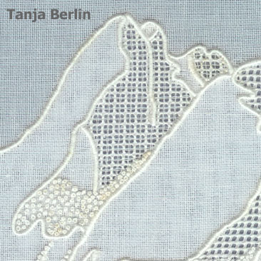 How the Embroidery is Worked: The fine embroidery is created by stitching three layers of fabric (two layers of shadow linen with a layer of net sandwiched in-between) are sewn together with embroidery stitches. When all the embroidery has been worked layers of linen are cut away from the back or the front of the work. This will leave some areas with two layers of fabric, some with one layer of fabric and some with just net creating a dimensional look to the embroidery. On the single layer of fabric pulled-work stitches are worked, in the net areas net stitches are worked.