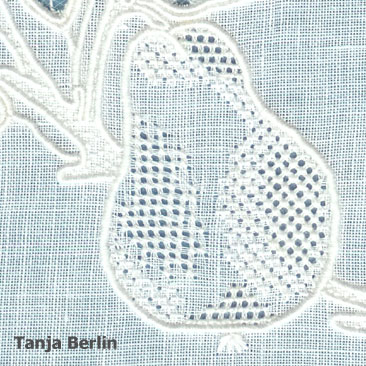 How the Embroidery is Worked: The fine embroidery is created by stitching three layers of fabric (two layers of shadow linen with a layer of net sandwiched in-between) are sewn together with embroidery stitches. When all the embroidery has been worked layers of linen are cut away from the back or the front of the work. This will leave some areas with two layers of fabric, some with one layer of fabric and some with just net creating a dimensional look to the embroidery. On the single layer of fabric pulled-work stitches are worked, in the net areas net stitches are worked.