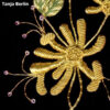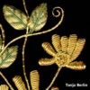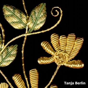 - Stems and Tendrils: The stems and tendrils are worked by couching down Japan thread. The Japan thread is synthetic so will not tarnish. Some of the tendrils have a seed bead on the end.