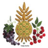 The pineapple is padded with felt and crochet cotton and then gold embroidery threads sewn over top. The grapes, cherries and leaves are worked in silk threads in surface embroidery stitches.