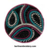 This “one of kind” needle minder has a strong magnet in-bedded in the center and the back is backed with black felt. A separate nickel coated/non marking magnet is used to fasten the needle minder to the fabric in the frame.