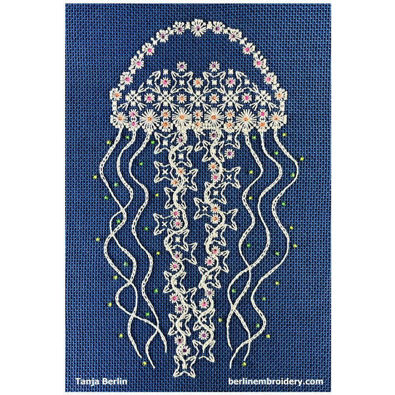 The Hapsburg Lace Moon Jellyfish are a beginners canvas work design and the Nettle Jellyfish is an intermediate canvas work design. You can purchase the kits or instructions separately or together to save.