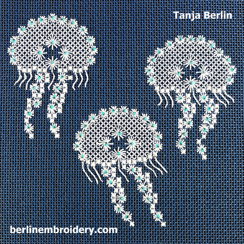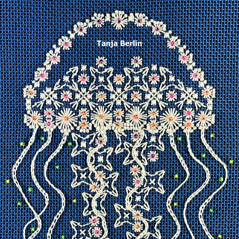 The Hapsburg Lace Moon Jellyfish are a beginners canvas work design and the Nettle Jellyfish is an intermediate canvas work design.