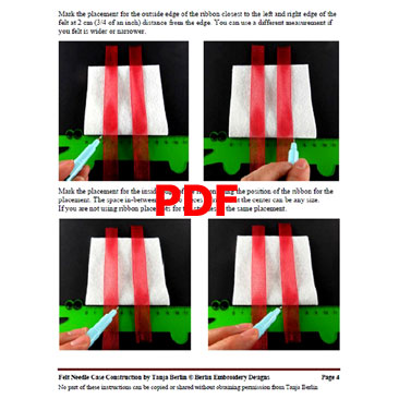 The instructions can be adapted for any size embroidery/needle case, by changing the measurements for the pages of felt, length of ribbon and thread for the desired size needle case.