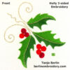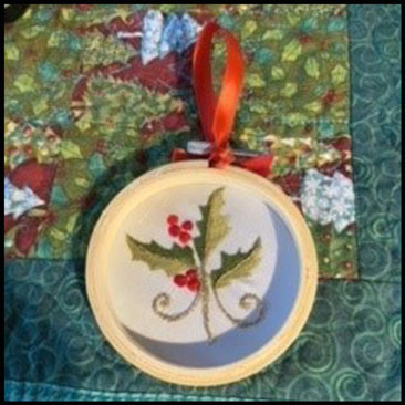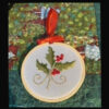 The photos of the holly displayed in the hoop is stitched by Melody McMath and the design is reduced to 80% to fit in a 3 inch hoop.