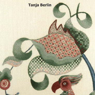 There are 22 surface embroidery stitches worked on in a single strand of the crewel wool on natural colour traditional Jacobean linen twill fabric.
