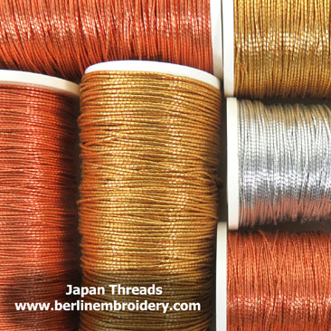 Japanese threads or Japan threads are made up of a synthetic foil wrapped around a fibre core that will not tarnish. The Kreink Japan threads are the softest of the Japan threads that I carry with the foil not as firmly wrapped around the fibre core.