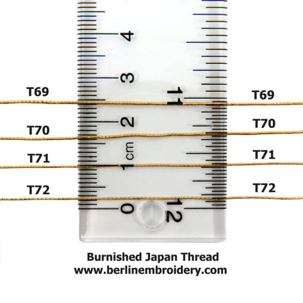 - T70 Japan thread is approximately 0.5 mm across the width of the thread (close in size to No. 8 (K4) Japan Thread and Kreinik No. 7 Japan Thread).