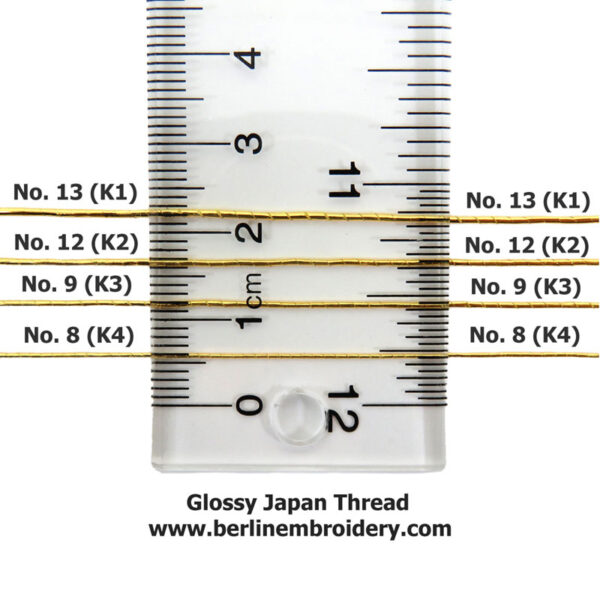 - No. 13 (K1) Japan thread is the thickest of the four Japan threads is approximately 1 mm across the width of the thread.
