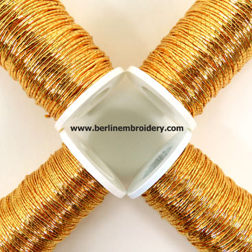 Lizerine is a wire that is wound into a tight coil that looks like a strand of gold pearls. The wire can be stretched to create different effects and used as outlines for designs or as a filling and can be combined with other threads for interesting effects. Lizerine is similar to Pearl Purl but has a squared appearance instead of rounded appearance.