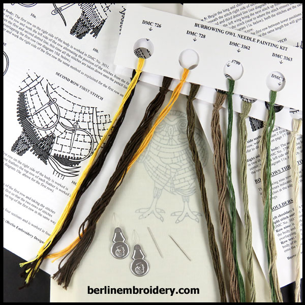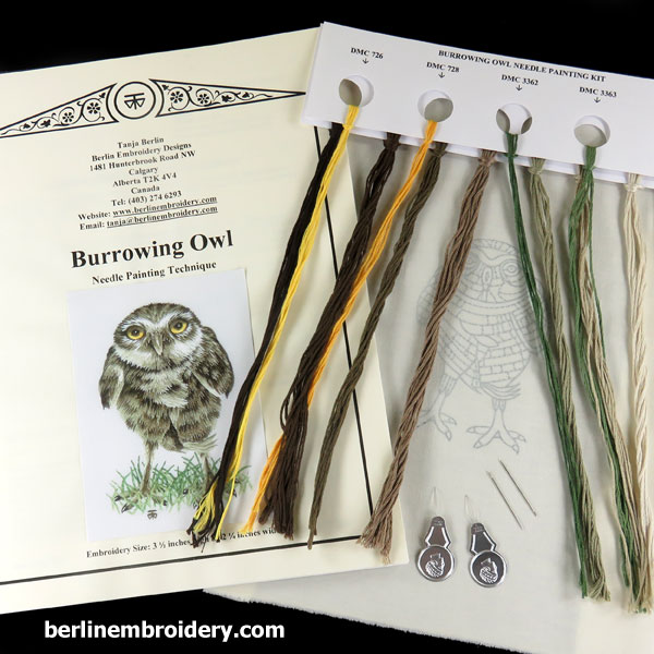 | Select | Burrowing Owl Needle Painting Kit, Packet of 15 Size 10 Crewel Embroidery Needles, Packet of 10 Wire Needle Threaders, An Extra Piece of Fabric with the Design Printed on |