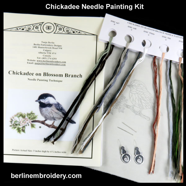 | Select | Chickadee on Blossom Branch Needle Painting Kit, Packet of 15 Size 10 Crewel Embroidery Needles, Packet of 10 Wire Needle Threaders, An Extra Piece of Fabric with the Design Printed on |