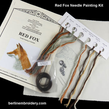 | Needle Painting Red Fox | Kit with Instructions, Kit with Instructions and 3 PDF Files, 3 PDF Files Only (If you already have the kit with instructions), Packet of 15 Size 10 Crewel Embroidery Needles, Packet of 10 Wire Needle Threaders, An Extra Piece of Fabric with the Design Printed on |