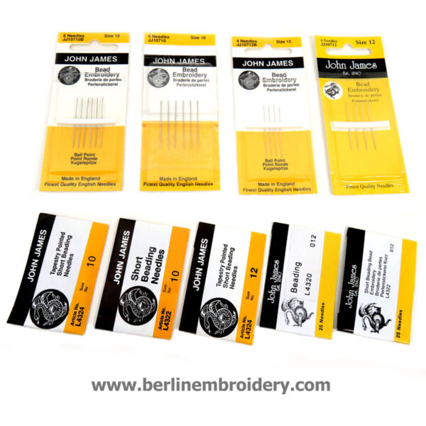 I carry the hard to find short beading needles which are excellent for goldwork embroidery when the size 10 embroidery/crewel needle will not fit through the center of purl or bullion threads. The needles are also good for very fine needle painting/thread painting. The needles are 1 1/4 inch ( 3 1/4 cm) long. The beading needles have a long slender eye for easier threading and a choice of sharp point or tapestry (ball) point. I carry size 12 (finest).