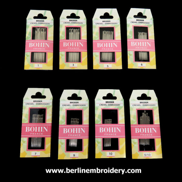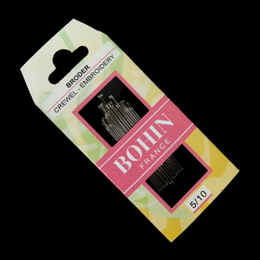 Embroidery or crewel needles have a long eye for easier threading, a slender shaft and a sharp point to the needle so that the stitches can be worked close together and there is more control for the placement of the stitches.